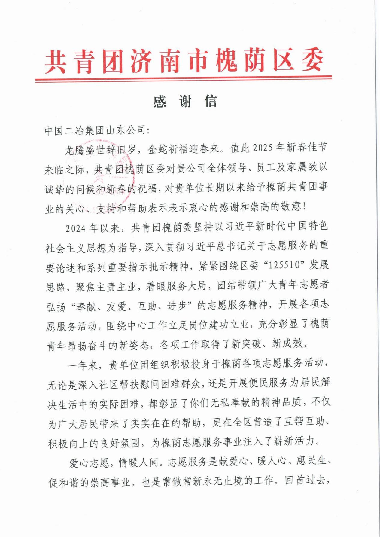 共青團(tuán)濟(jì)南市槐蔭區(qū)委在信中寫道,山東公司團(tuán)委積極投身于槐蔭各項志愿服務(wù)活動,無論是深入社區(qū)幫扶慰問困難群眾,還是開展便民服務(wù)為居民解決生活中的實際困難,彰顯了無私奉獻(xiàn)的精神品質(zhì),為廣大居民帶來了實實在在的幫助,更在槐蔭區(qū)營造了互幫互助、積極向上的良好氛圍,為槐蔭志愿服務(wù)事業(yè)注入了嶄新活力。